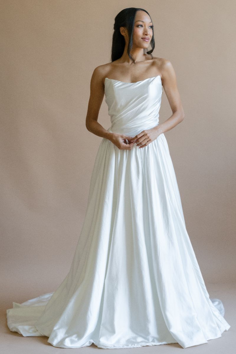 This elegant gown is a strapless A-line wedding dress made from a smooth, lustrous fabric. It features a softly draped neckline and a ruched, fitted bodice that cinches at the natural waist before flowing into a voluminous, full skirt with a short train. The minimalist design relies on the quality of the material and the flattering silhouette for its timeless and sophisticated appeal.