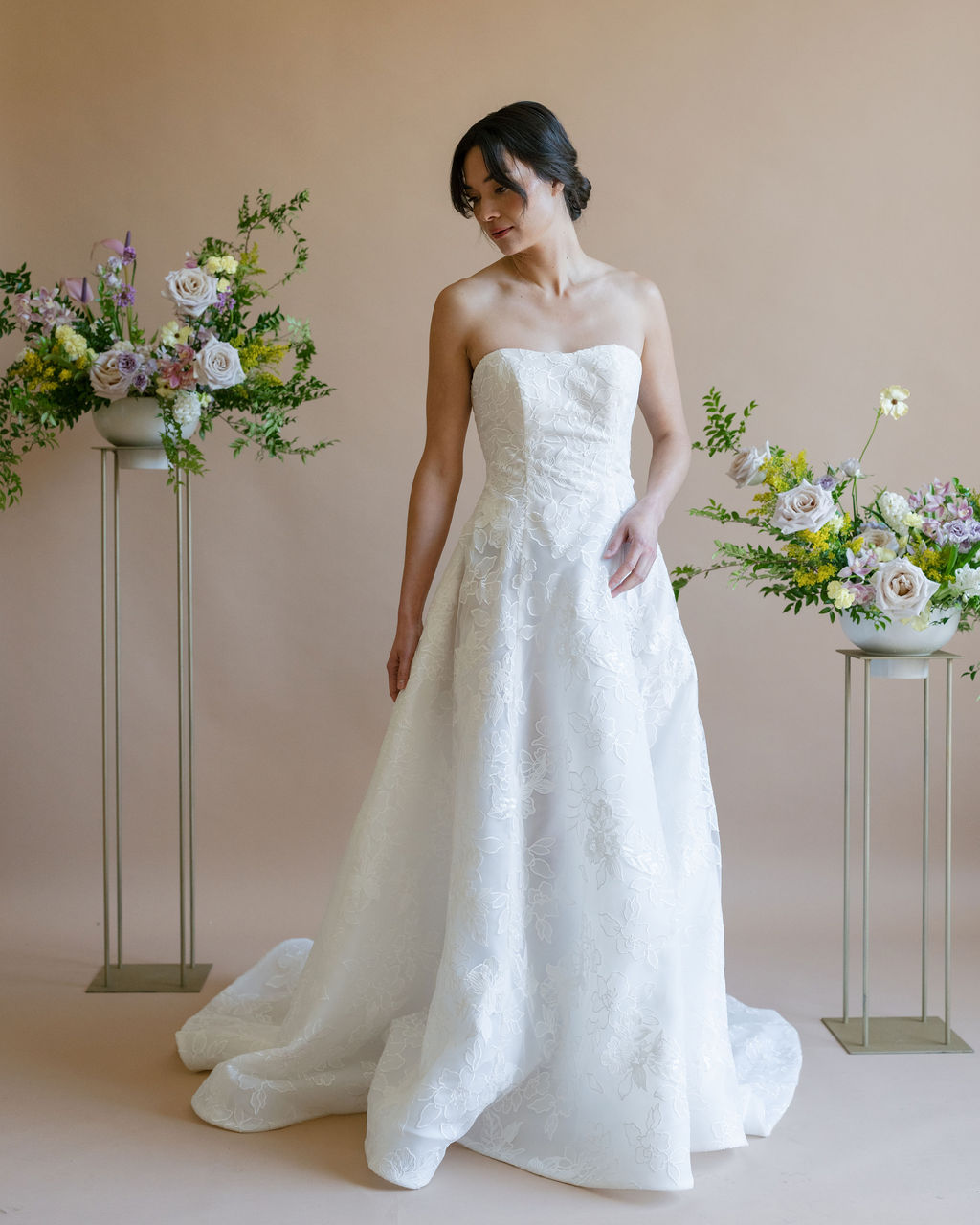 The classic A-line silhouette is known for being universally flattering, as it cinches at the natural waist to create an hourglass effect while providing comfort and ease of movement. This particular design embodies a timeless and sophisticated bridal look.