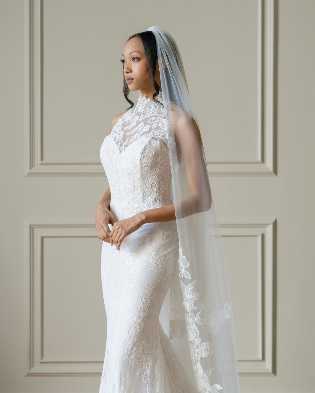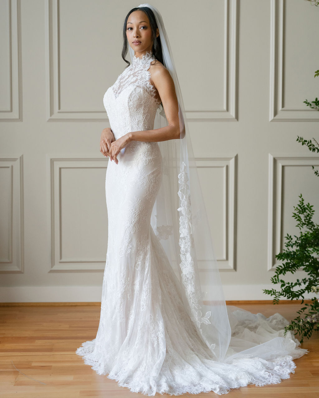 This elegant gown is a high-neck lace fit-and-flare wedding dress that combines a sophisticated silhouette with intricate detailing. This style is both modern and timeless, highlighting the shoulders and creating a sculpted, romantic look.